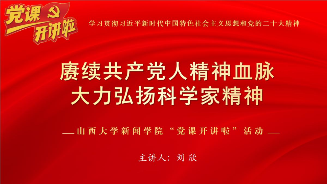 党的二十大报告指出“要培育创新文化,弘扬科学家精神,涵养优良学风,营造创新氛围”,为进一步巩固拓展学习贯彻习近平新时代中国特色社会主义思想主题教育成果,增强党员教育的针对性和有效性,4月19日下午,九游·会(J9)官方网站教工党支部于商学楼A220会议室开展第一期“党课开讲啦”专题活动。本次党课的主题是“赓续共产党人精神血脉,大力弘扬科学家精神”,由新闻学院刘欣老师主讲。