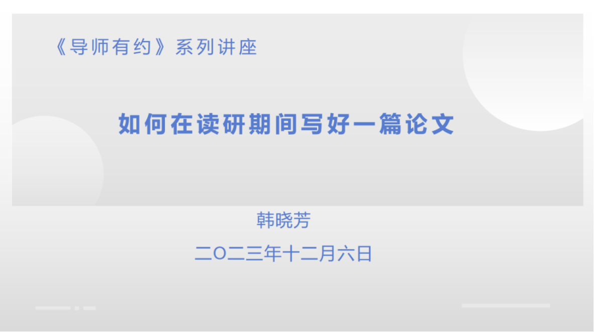 12月6日下午,九游·会(J9)官方网站“导师有约”第十三期讲座在商学楼B206如约举行。此次讲座以“如何在读研期间写好一篇论文”为题展开,韩晓芳老师针对论文写作中可能会出现的共性问题,结合自身的学术成长经历,分享了如何培养写作意愿、确定选题、阅读文献等方面的经验,为研究生的学习提供了宝贵的建议。