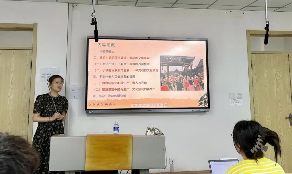 讲座伊始,张洁老师探讨了“流动的博物馆”的概念及其转化为文化景观的过程,明确提出了本选题的研究意义。张洁老师详细回顾了“既往研究的三种视角”,包括从旅游人类学视角分析旅游的性质和特征、旅游对文化的作用以及旅游对城乡社会发展带来的影响。