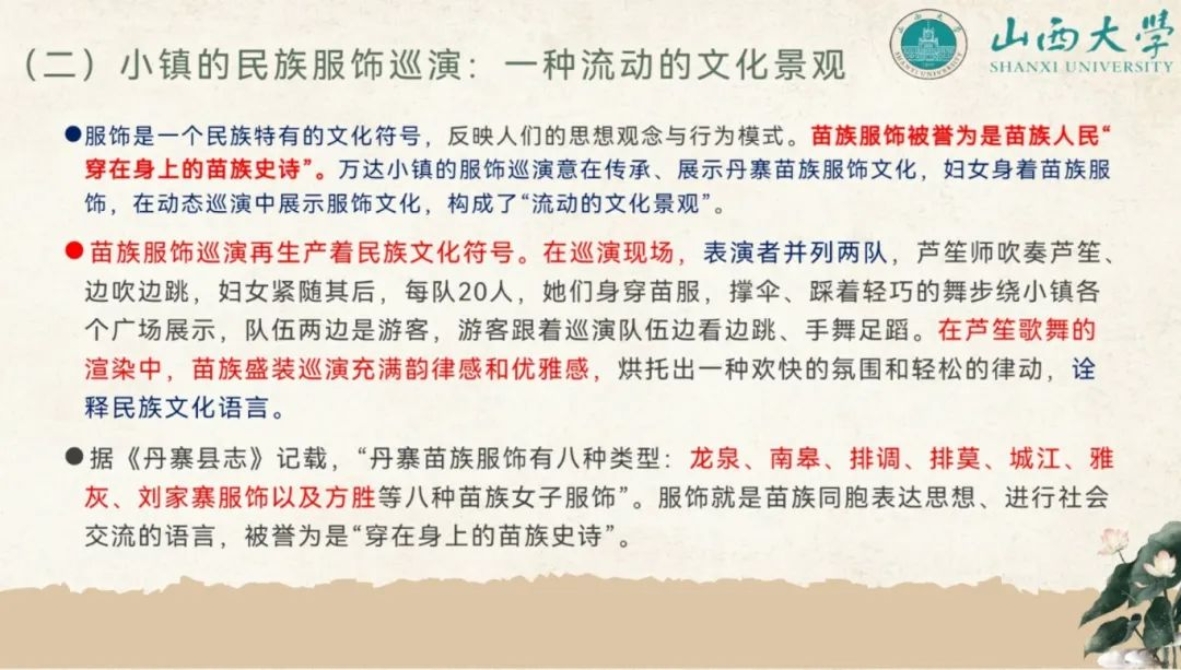其次,张洁老师采用参与观察法和个案访谈法,对丹寨万达小镇的民俗旅游表演进行仪式过程分析和社会结构分析。她从小镇的民族服饰巡演出发,对苗族服饰的款式语言、图案语言和配饰语言等符号意义进行了详细的介绍,重点讲述了苗族服饰八种服饰巡演,强调万达小镇的服饰巡演意在传承、展示丹寨苗族服饰文化,在动态巡演中展示服饰文化,构成了“流动的文化景观”。张老师还指出了民俗旅游中多主体互动的重要性,包括游客、展演者、主办方、政府和媒体等,通过主客互动、观演互动和消费互动,促进了文化景观的再生产。特别是“非遗周”的蜡染技艺展演,展现了文化主客体在展演全过程中的互动。