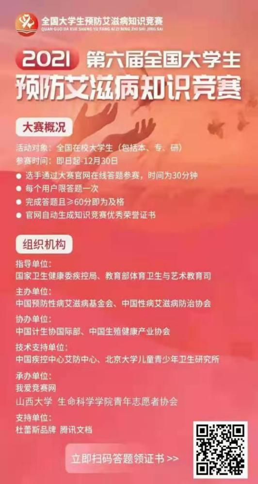 3.开展一次知识竞赛。各学院既可以自行组织线下竞赛,也可以组织学生参加“第六届全国大学生预防艾滋病知识竞赛活动”(详见下图宣传海报),形成线上理论学习和线下宣传实践相结合的活动模式。