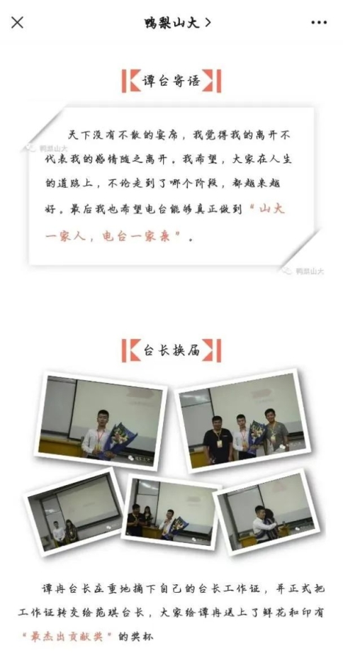 作为山西大学校园广播学府之声的公众号,鸭梨山大对学府之声广播进行了详细介绍,包含组织成员结构、部门分工及其工作内容等,并陆续开发了校园点歌平台、资讯学府之声招新信息等服务功能,是校园广播的宣传部和服务台。