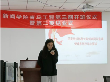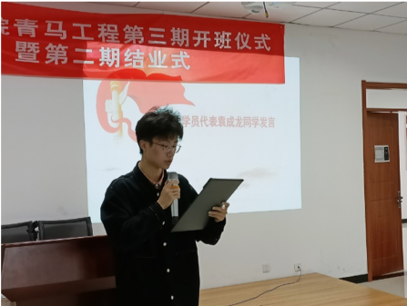 第三项,团委书记张丽宣读了第三期青马学员名单。并由团委组织部部长陈剑琪向青马学员们宣读了管理条例和毕业要求,21级新生袁成龙作为第三期学员代表进行了发言。