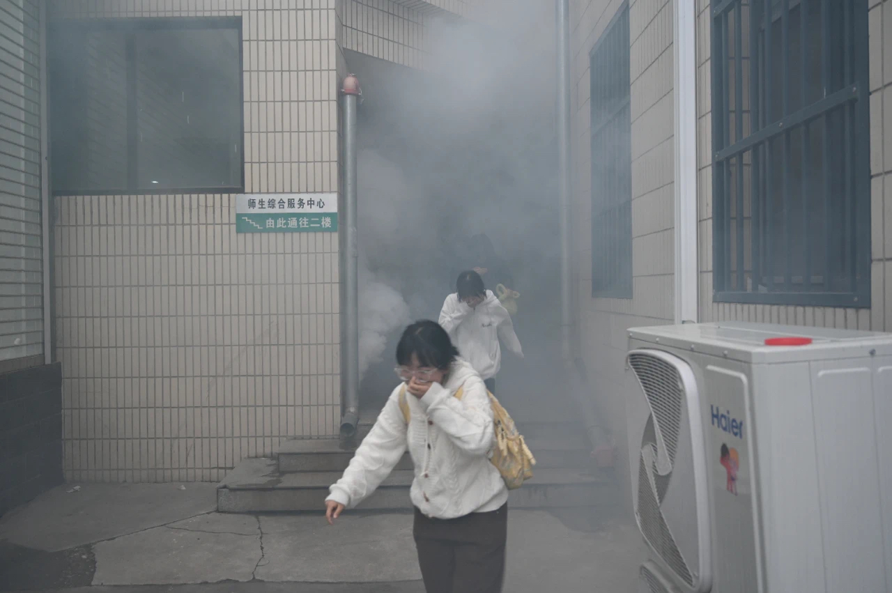 随后,学生来到商学楼开展消防演练。伴随警报响起、烟雾弥漫,消防演练正式开始。学生们在听到警报后,迅速按照预先设定的疏散路线,有序地向安全区域撤离。在撤离过程中,学生们保持冷静、不慌乱、不推搡,确保了撤离过程的安全与高效。
