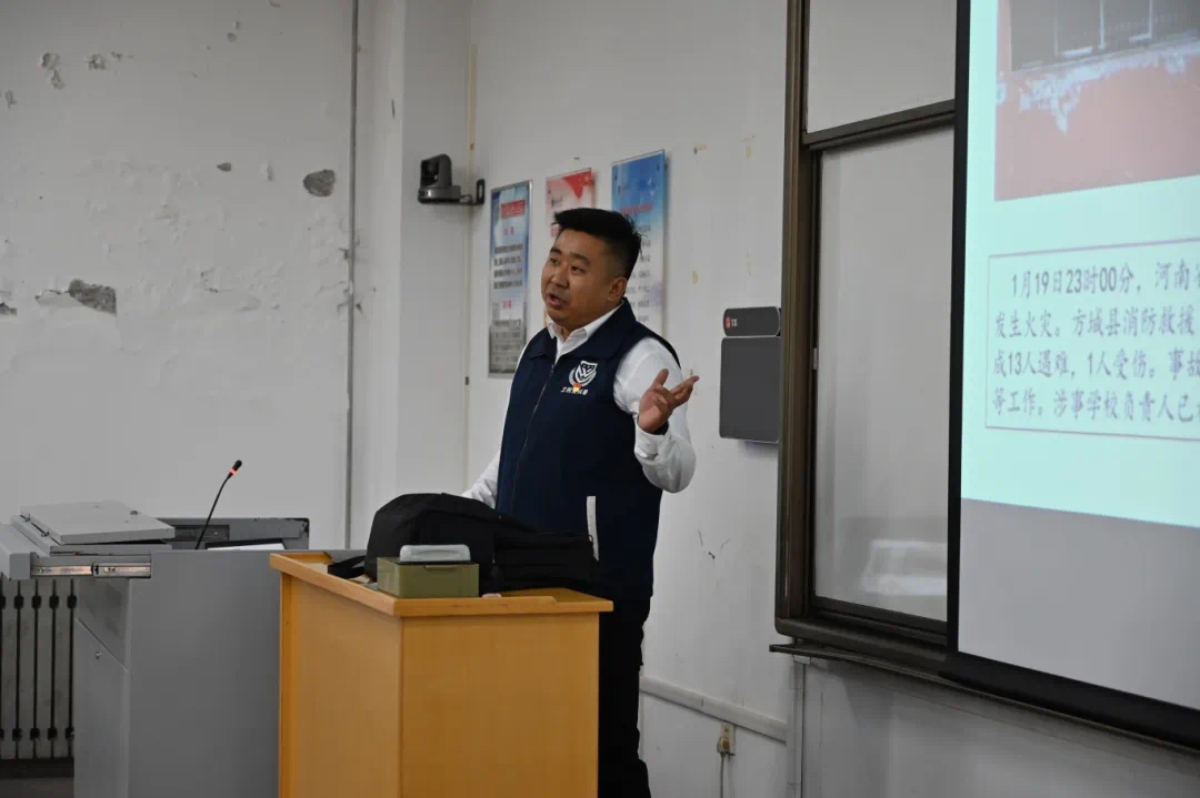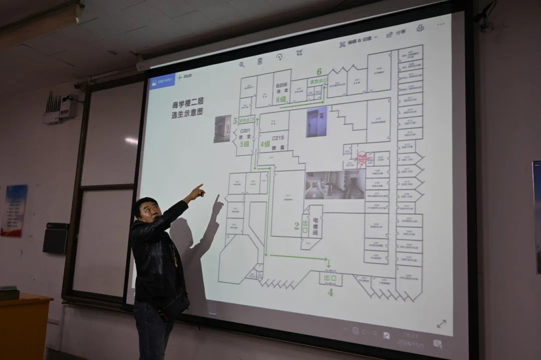 活动伊始,北京市卫民安消防教育咨询中心山西分中心副主任郭帅讲师在文科楼为全院学生带来了消防安全专题讲座。郭帅讲师结合近年来发生的典型火灾案例,深入浅出地向大家剖析了火灾的成因、危害以及遇到突发情况时火场逃生的自救方法,让大家对火灾的危害有了更加深刻的认识,对基本的防火、灭火、逃生、自防自救知识与技能也有了更加深刻的理解和掌握。毋伟老师向大家讲解了商学楼消防演练逃生路线。