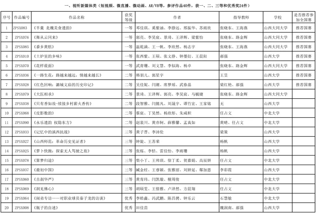经山西分赛区办公室审核、专家评审,共有56部获奖作品脱颖而出,其中视频新媒体类24部、数据多媒体类31部、数字系统设计类1部,拟推荐参加全国赛总数17部,占总作品数比例18%。