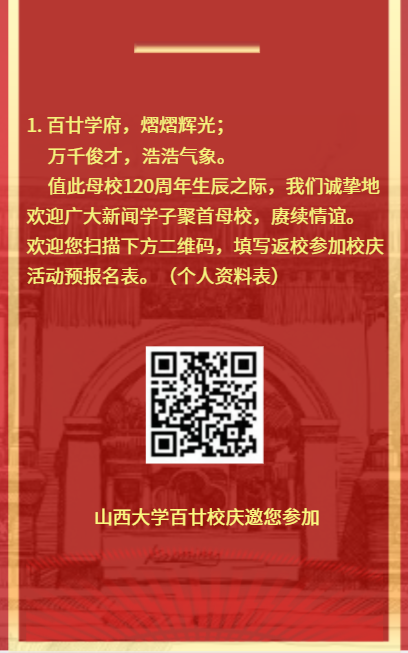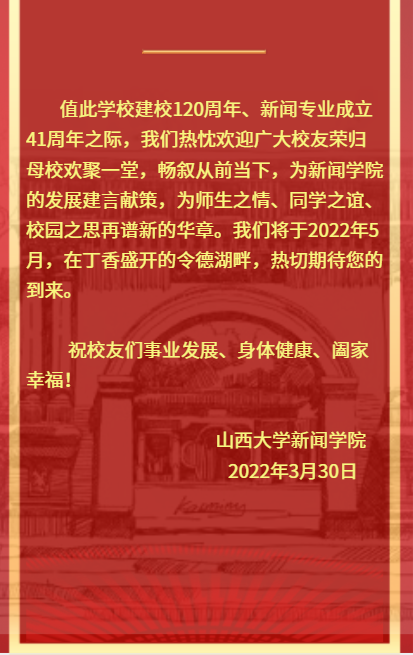九游·会(J9)官方网站在母校成立120周年之际,面向广大校友发出邀请函(H5)。内附有意愿参加校庆活动的校友报名表和