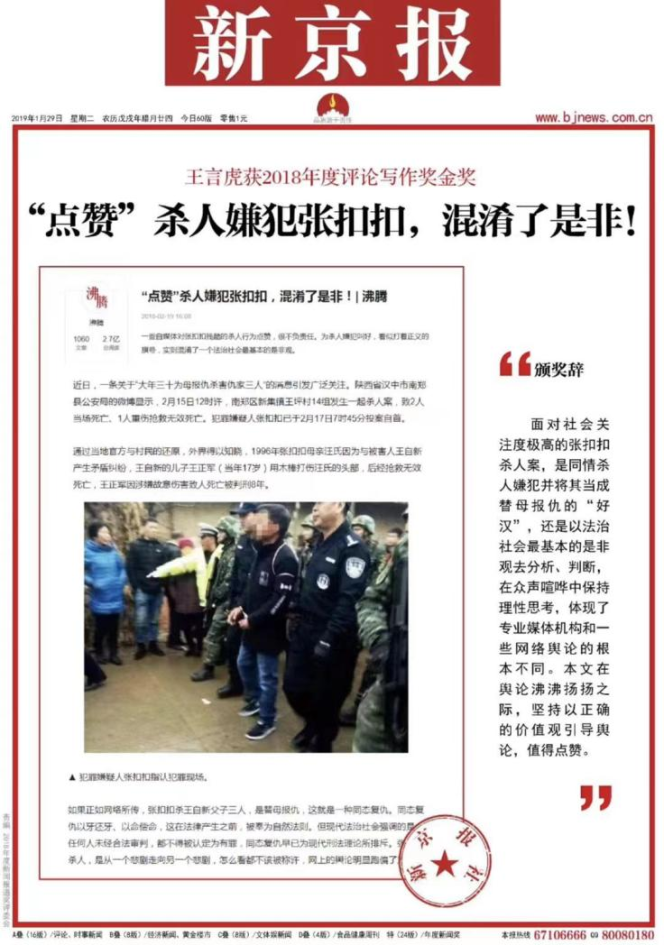 第一篇是获2018年度新京报评论写作奖金奖的作品《“点赞”杀人嫌犯张扣扣,混淆了是非!》。整体上,这篇文章从立场、表达、措辞等方面把握得比较准确、稳妥。当时,面对社会关注度极高的张扣扣杀人案,是同情杀人嫌犯并将其当成替母报仇的“好汉”,还是以法治社会最基本的是非观去分析、判断,在舆论场引发巨大争议。而且,同情并赞许张扣扣的声音似乎还占主流。舆论沸沸扬扬之际,我们认为坚定地站在法治一边,坚持以正确的价值观引导舆论,相当有必要。