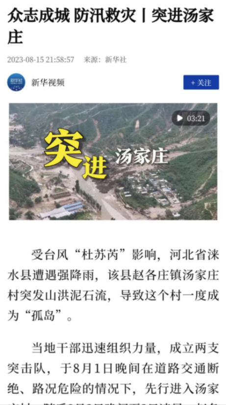 《突进汤家庄》是我在河北涞水县所作。当时河北多地受灾严重,就包括河北的涞水县。接到总编室命令,我连夜驱车从阜平赶往涞水,一路上阴雨不断。到达涞水后,我发现几个山区乡镇的受灾情况远远超出我的想象,其中受灾较为严重的就有这个汤家庄村。7月31日,天降暴雨,由于山体泥石流和洪水冲刷,道路断交,该村一度成为“孤岛”。我也在这种情况下,冒着次生灾害的危险,进入该村。这个作品就是我通过视频的形式纪录当地干部群众和武警官兵突进汤家庄、抢险救灾的紧急时刻。作为前线记者,我驻扎涞水数十天,采写数篇报道和内参,真实反映了灾区现状、抢险救灾和灾后重建的一线情况,为决策提供了参考。