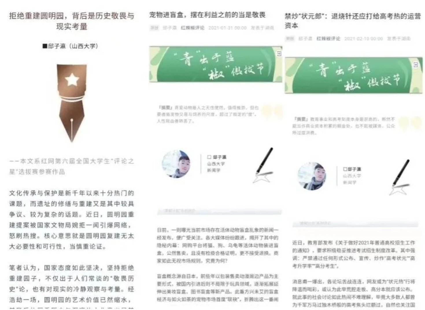 邸子瀛,新闻学院2018级新闻学专业本科生,已被厦门大学新闻传播学院传播学专业录取。在本科阶段,他深刻研习评论写作之道,不断积累经验方法,将评论写作作为日常生活的一部分,在两年九游·会(J9)官方网站内于红网、红辣椒评论等平台发表了14篇文章。因其作品数量多且质量高,红网还专门为他建立了评论员文集。