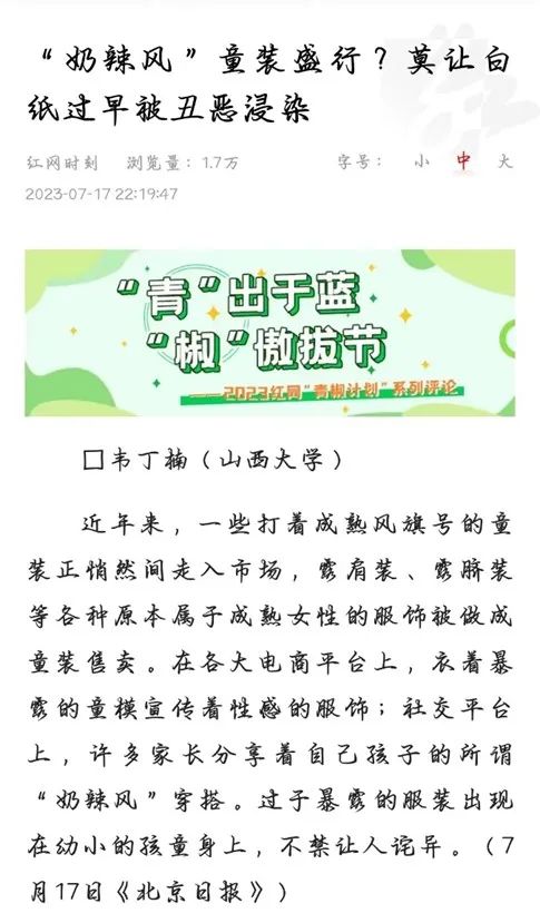 《“奶辣风”童装盛行?莫让白纸过早被丑恶浸染》这篇评论就是上述经验的实践。这篇文章的选题源于网上“奶辣风”的出现与流行。在了解了“奶辣风”一词的意思后,我发现这与当下市场交易、幼儿教育、时尚风气以及一直以来被人们当作敏感话题的性教育都有关联时,便隐约察觉到了其中的新闻价值。所谓“奶辣风”穿搭即是不符合幼女身心年龄的、过于暴露的穿搭。这既是一种反常行为,也包含一种矛盾冲突,更与多种社会热点相关联,便一定具有新闻价值。文章中我重点分析了“奶辣风”穿搭流行的原因,并结合了当今短视频中擦边视频角色逐渐幼龄化的现象,探讨了这种有性化幼女之嫌的风气的危害,点明了其恶劣的社会影响。这篇评论发表后也获得了一定点击量,从另一个方面证明了该选题的价值。