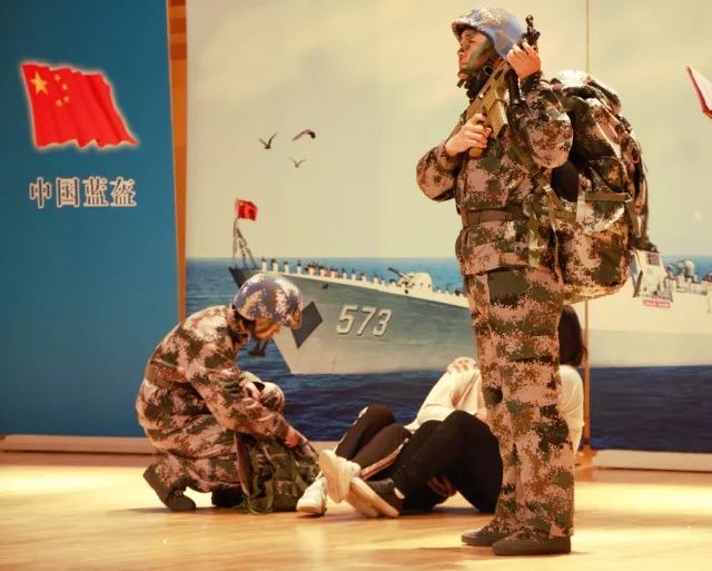 终于,经过了近两个小时的等待,《中国蓝盔》的演出正式开始,一遍遍的排练,一个个细节的修改,使得同学们在演出进行中几近完美地完成了每一个步骤。无论是士兵的威武英姿,难民的悲苦疾呼,抑或老父亲送别参军女儿的不舍和自豪都一一呈现在观众眼前给人以震撼。朗诵同学铿锵有力的演讲同样使观众感受到了同学们蓬勃的朝气。演出结束后观众为同学们精彩的表现献出了热烈的掌声。