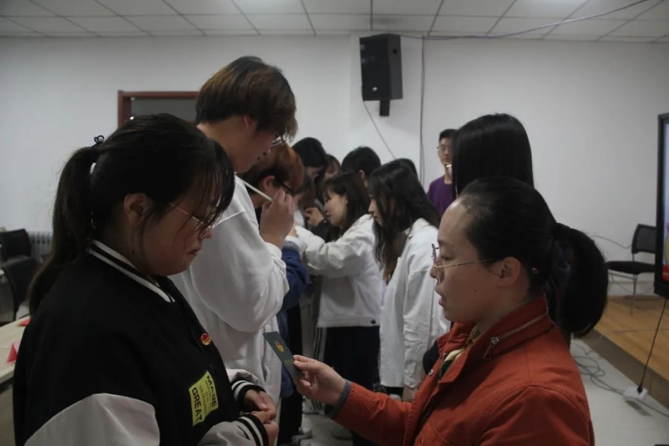 宣誓后,为每位新入团团员颁发了团员证及团徽,象征着这8名同学正式成为一名光荣的共青团员。