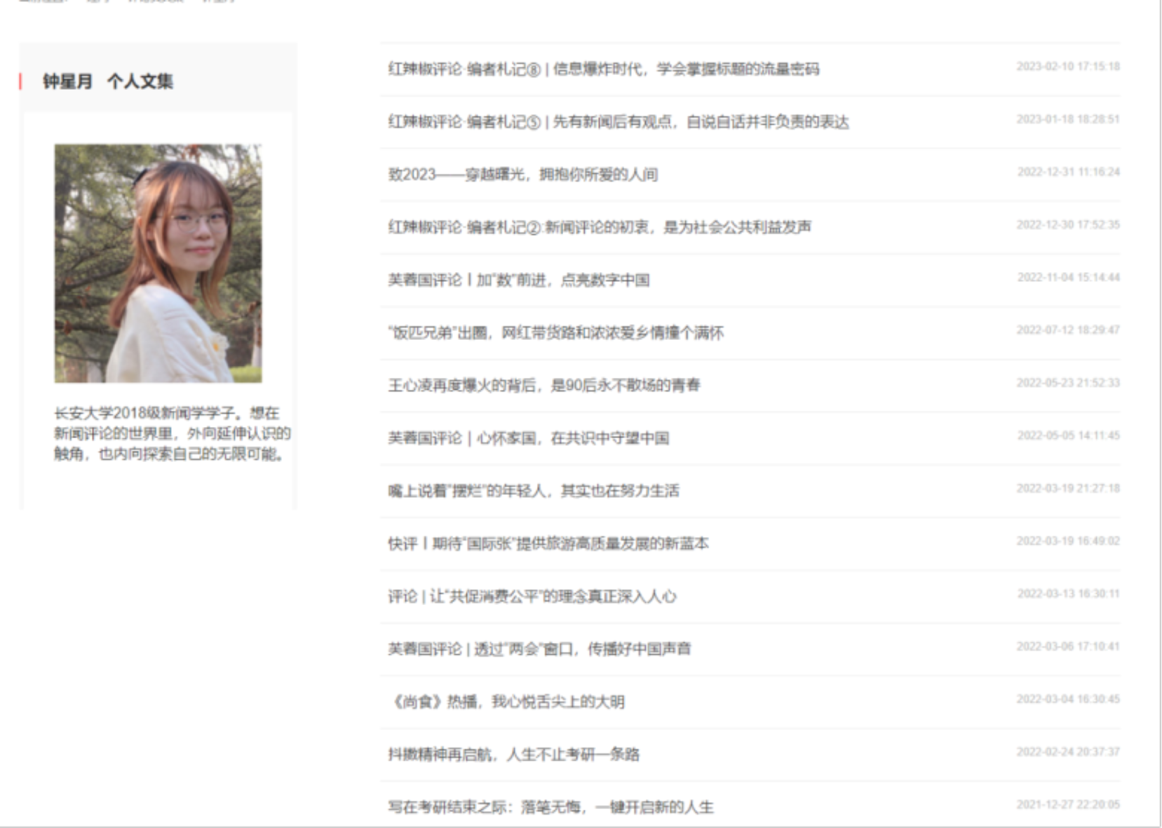 钟星月,2022年毕业于长安大学新闻学专业,现任红网理论评论中心红辣椒评论编辑。获红网第六届全国大学生“评论之星”选拔赛入围奖、“青椒计划”7月优胜作者。代表作品有:《坍塌的不是明星形象,而是你的童话城堡》《“救命文档”背后,青年力量值得全社会点赞》等。