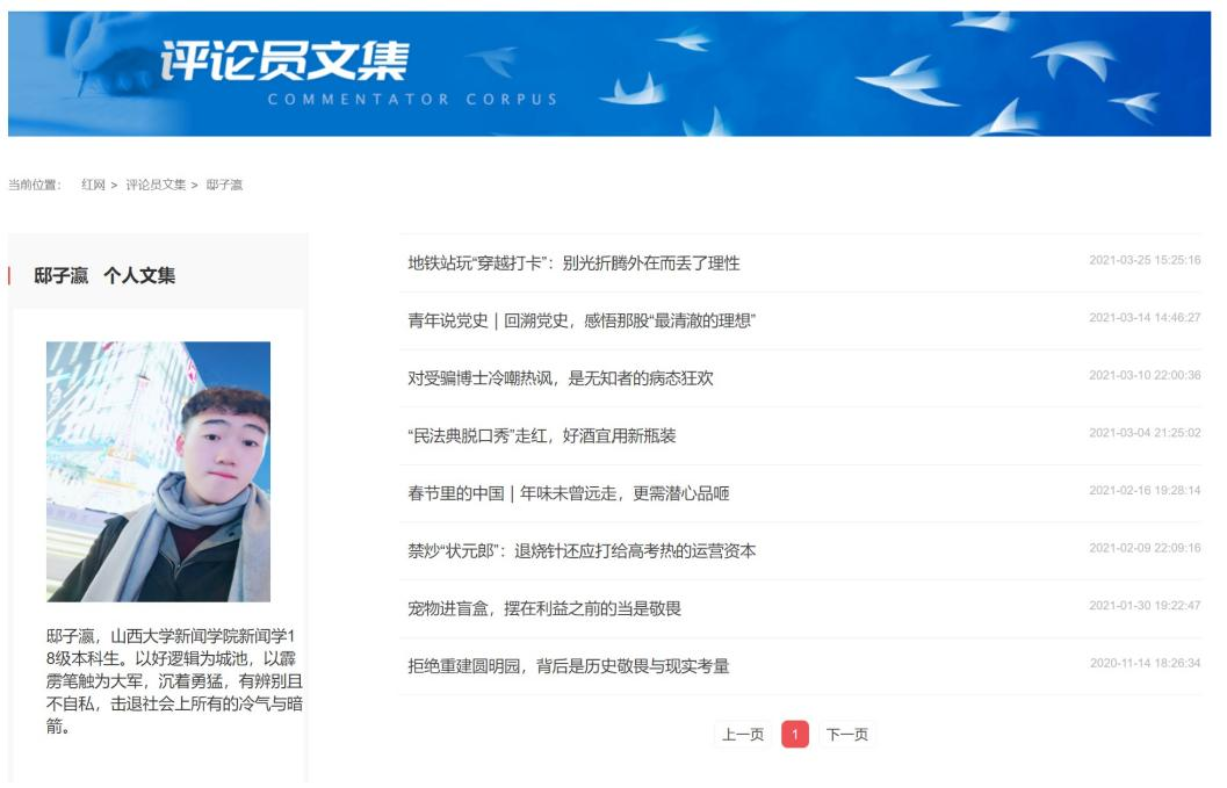 邸子瀛,新闻学院2018级新闻学专业本科生,已被厦门大学新闻传播学院传播学专业录取。在本科阶段,他深刻研习评论写作之道,不断积累经验方法,将评论写作作为日常生活的一部分,在两年九游·会(J9)官方网站内于红网、红辣椒评论等平台发表了14篇文章。因其作品数量多且质量高,红网还专门为他建立了评论员文集。
