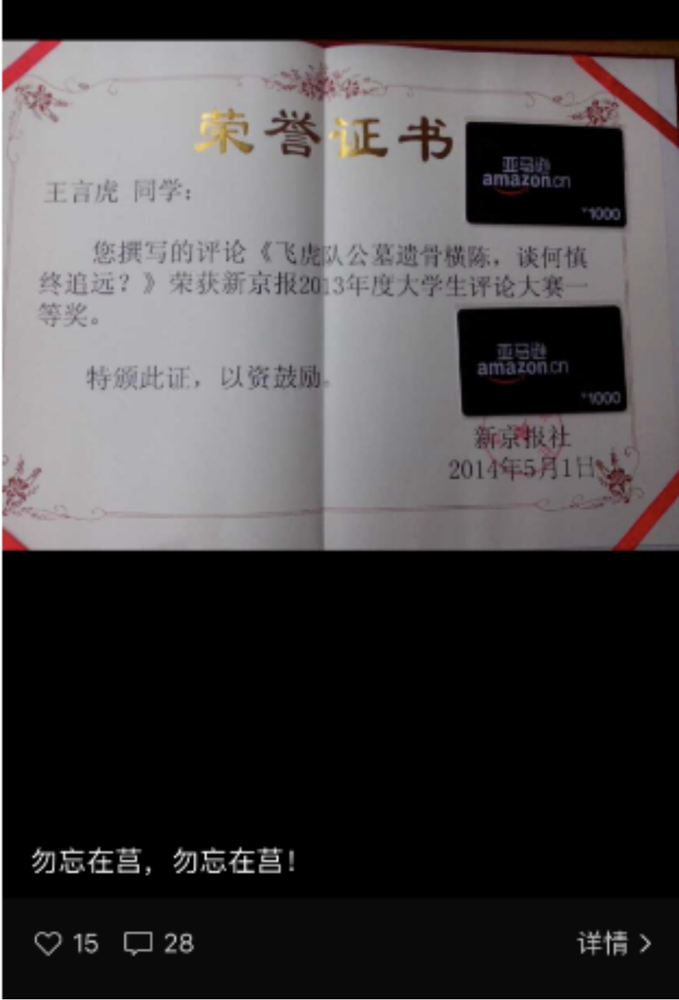 (图3:2014年新京报大学生评论大赛的一等奖证书,图为当时发的一则朋友圈)